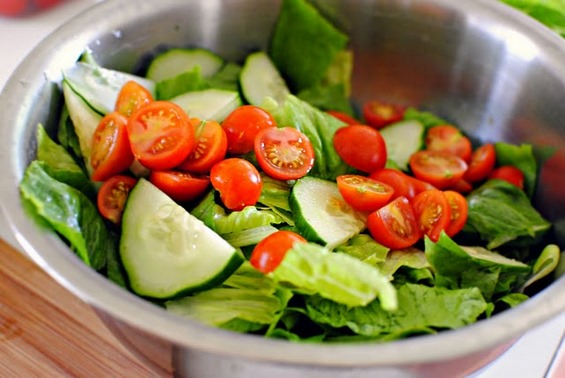 Марулата исечете ја на крупни парчиња, доматите на половинки и краставичката на тркалца.