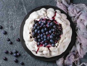 5. Во тенџере измешајте ги млекото, жолчките, брашното, шеќерот и слатката павлака. Сварете ја смесата и додадете половина од боровинките, изгмечете ги за кремот да добие виолетова боја. Додадете ги останатите боровинки и измешајте. Истурете го кремот врз изладената кора.