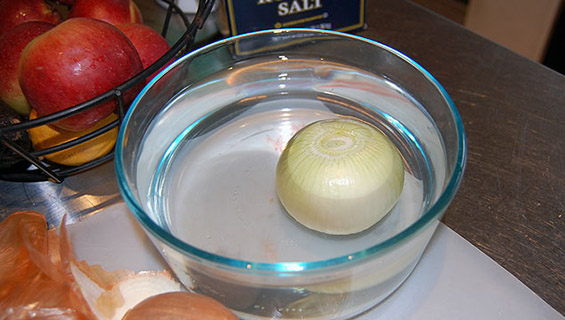Излупете го кромидот и исечете ги краевите. Потопете го во сад со вода и оставете го да постои 15 минути за да ги извлече сулфурните состојки во неа. Потоа, извадете го кромидот и сечкајте го без солзи и без јако печење на очите. Недостатоци од примена на овој трик се тоа што кромидот ќе биде полизгав и ќе изгуби од својот вкус.