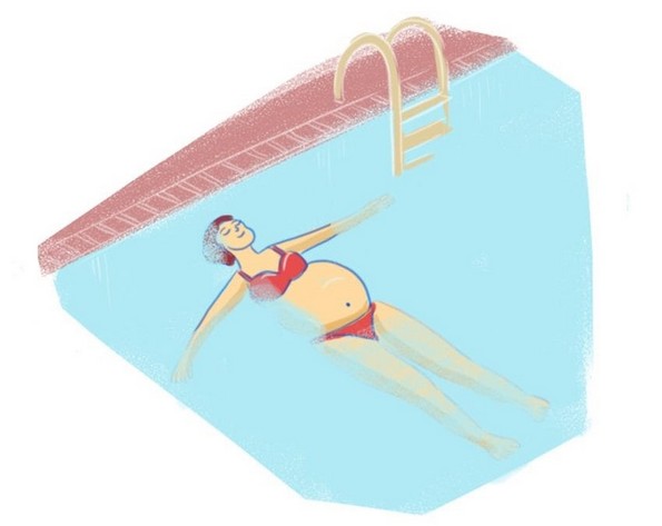 Вишокот тежина може да има големо влијание на грбот и нозете во доцната фаза од бременоста. Предноста на летото е што можете да користите базен за да го решите овој проблем. Додека сте во водата обидете се направите неколку едноставни вежби за истегнување. На овој начин вашето тело ќе остане во форма и полесно ќе се справи со вишокот килограми. Покрај тоа, базенот ќе ве разлади.