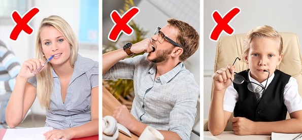 Ова е навика што многумина ја имале како деца, но некои возрасни не се откажале од неа. Со џвакањето моливи, пенкала или што било што не е храна внесувате многу бактерии во устата. Оваа навика е директно поврзана со триењето на забите, а неконтролираното џвакање е резултат од стрес. Ако не можете да престанете, обидете се да го измамите вашиот мозок. Подобро џвакајте гума за џвакање или некоја мала ужина.