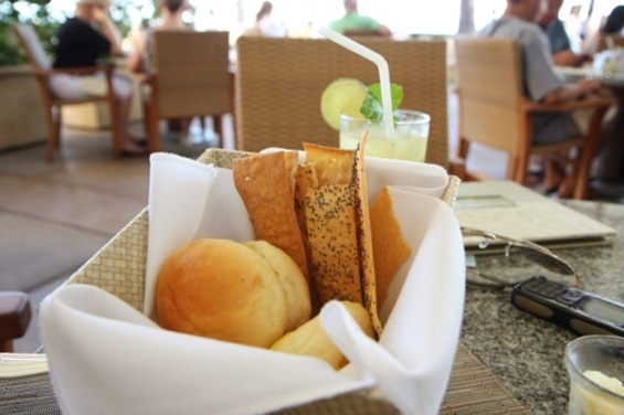Многу ресторани служат парчиња леб или фурнаринки во кошница и го даваат заедно со салата или некое макало. Замолете го келнерот да го тргне од масата (освен ако некој колега не сака да го јаде, па понудете му го нему). Така, нема да паднете во искушение и трпеливо ќе чекате да пристигне нарачаното. Побарајте чаша вода и пијте сѐ додека не ви стигне главниот оброк.