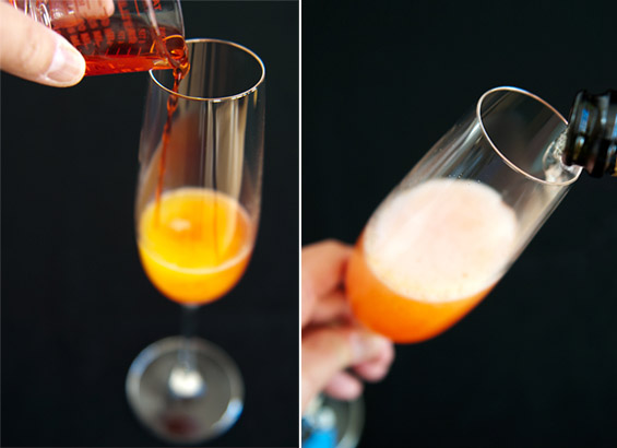 Секоја висока чаша наполнете ја со 1 голема лажица кампари и 1/4 шолја сок од портокал. Промешајте. Благо навалете ја чашата и наполнете ја со шампањ. Секоја чаша декорирајте ја со спирални кори од портокал. Служете веднаш.