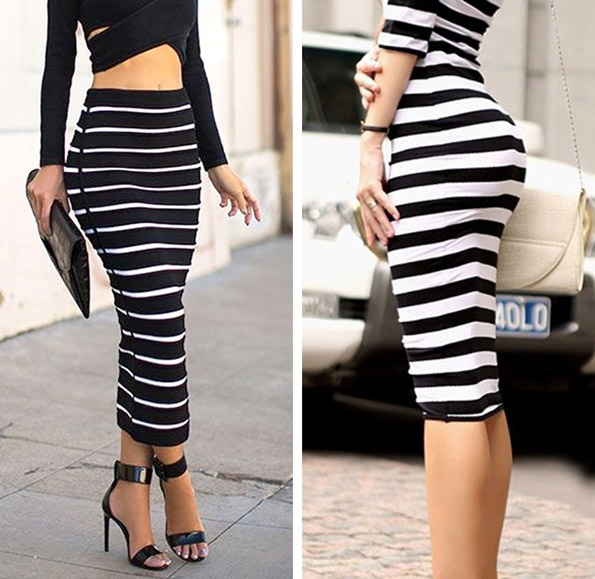 Фустаните и здолништата со хоризонтални линии во контрасни бои се создадени за да го направат телото поженствено и елегантно. Овој модел визуелно ги зголемува колковите и на тој начин го прави вашите задник позаоблен.