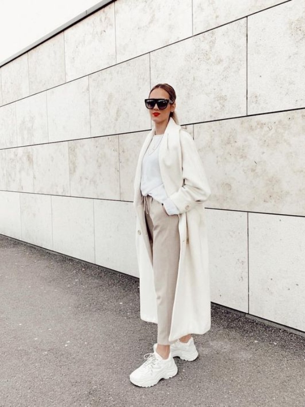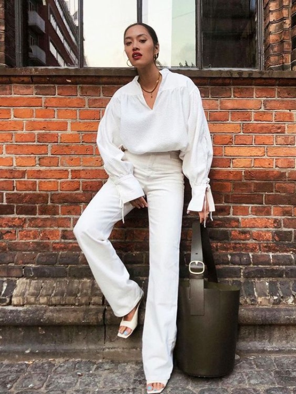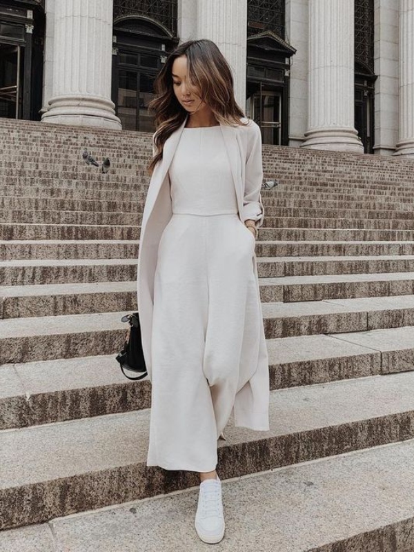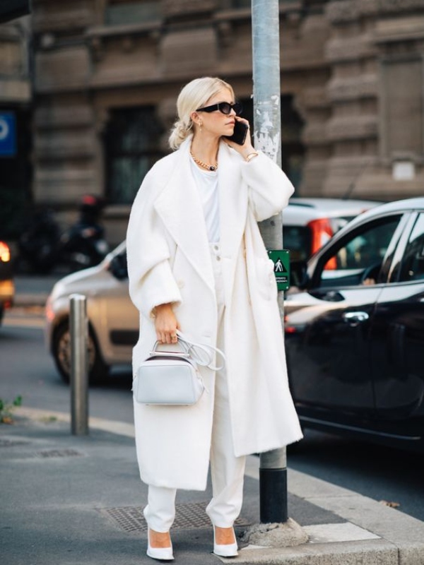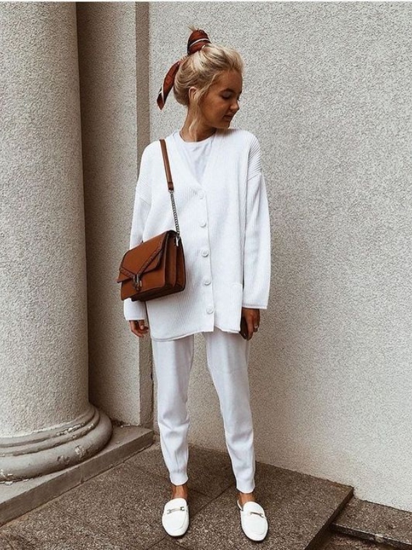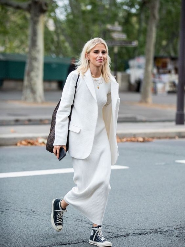 Ако сакате да ја истакнете монохроматската бела облека, комбинирајте со бели патики и помала чанта. Ако сакате контрастни детали, комбинирајте со црни патики и потемна чанта.