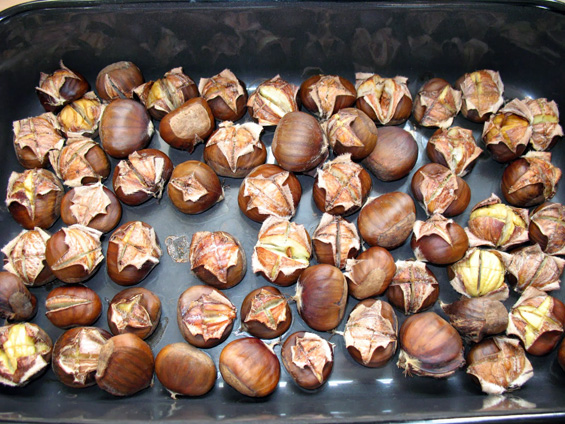 Загрејте ја рерната на 200 степени Целзиусови. Користејќи мал, остар нож направете длабок рез на едната страна од секој костен. Ставете ги во тава и печете ги 30-40 минути, додека кората да се отвори и внатрешноста да омекне.