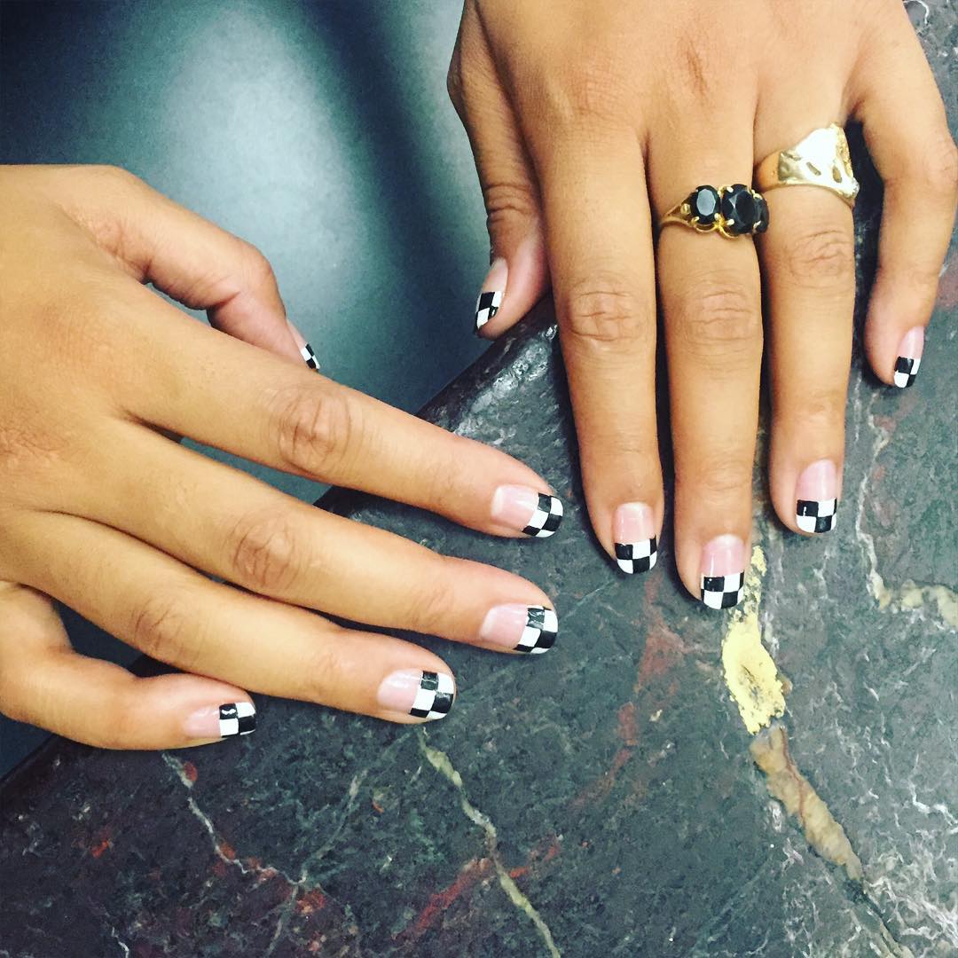 За „шаховски нокти“ потребно е на самиот нивен врв да направите вообичаен француски маникир. Кога ќе се исуши, нанесете црни коцки што ќе ја формираат таблата.