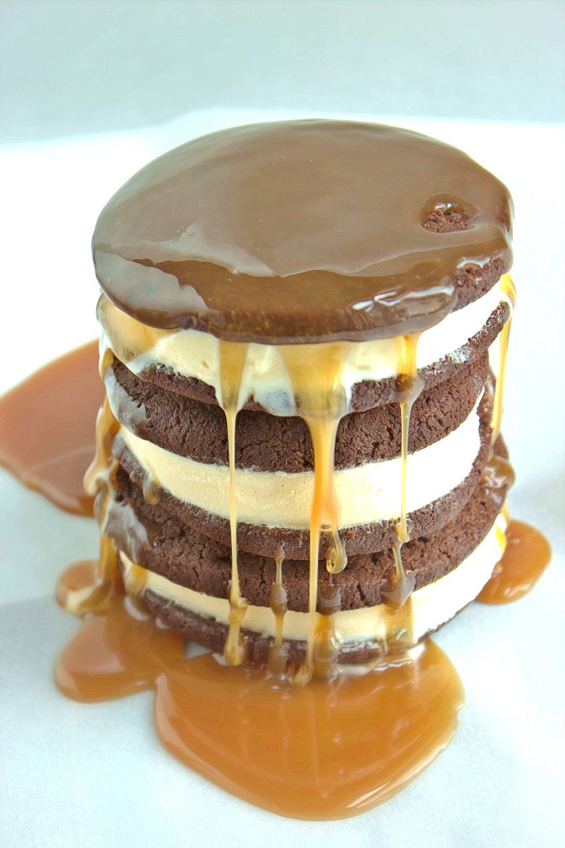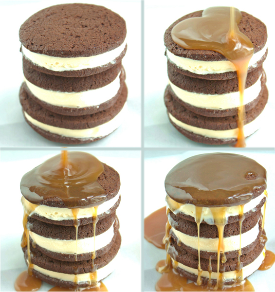 7. Завиткајте го секој ајс сендвич во хартија за печење, наредете ги во една тацна и оставете ги во замрзнувачот сè до нивното послужување. Кога ќе сакате да ги послужите, прелијте ги со прелив од карамела и стопено жешко чоколадо.