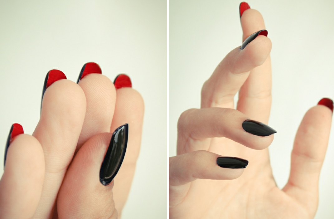 - На горната страна на ноктите нанесете два слоја лак за нокти во кожа боја или пак црн.