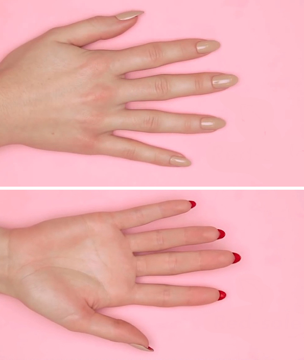 - На внатрешната страна на ноктите со тенка четкичка нанесете јако црвен лак за нокти сè до кожата на прстите.