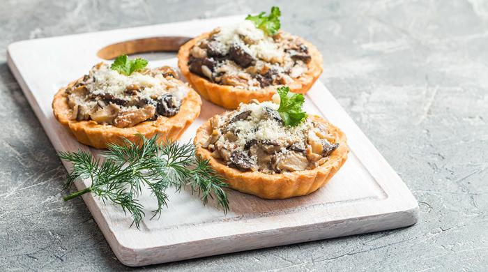 Поставете го тестото на парче проѕирна фолија, па прекријте го со друго парче и потоа развлечете го сè дур не дојде на дебелина од 3-4 милиметри. Намачкајте ги калапите со големина од 8-11 сантиметри со путер (околу 50, 60 грама), и исечкајте го тестото на парчиња што ќе бидат околу 2 сантиметри поголеми од калапот. Пополнете ги калапите, покријте со алуминиумска фолија и печете 15-тина минути на 180 степени.