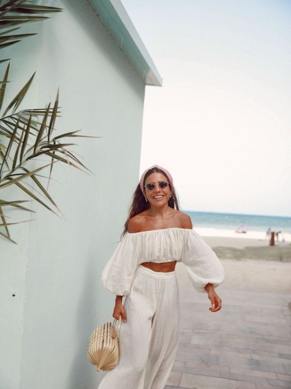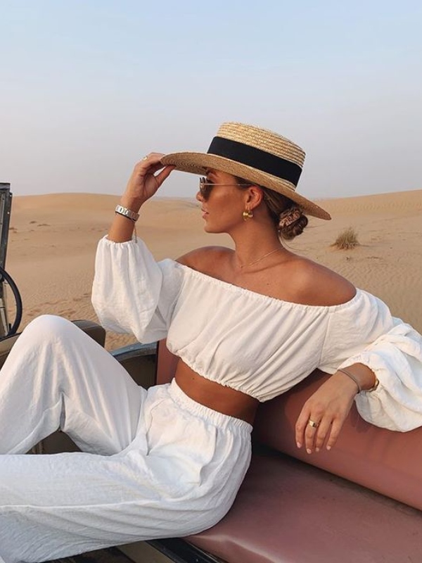 Панталоните со висок струк, широк шешир и очила, заедно со маица без рамена ќе направат да изгледате феноменално. Ова секси и опуштено парче облека едноставно ве привлекува да го комбинирате со некои удобни сандали, раскроено здолниште и впечатлив накит.
