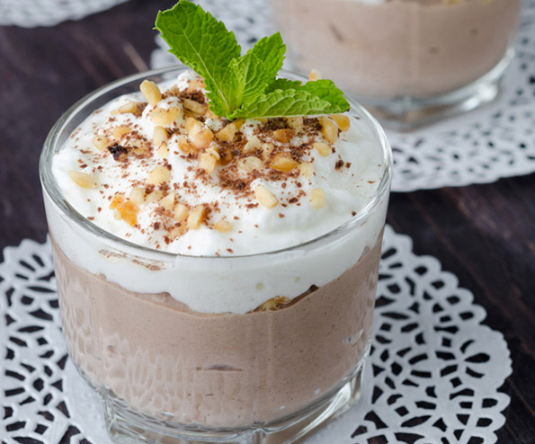 Остатокот од павлаката изматете го со останатиот шеќер и украсете го десертот. Мусот може да го послужете и со бонбони со вкус на кафе, ливчиња од нане или сецкани бадеми.