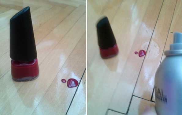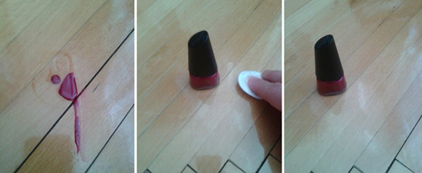 Дамките од лак за нокти брзо ќе ги отстраните со лак за коса при што е важно брзо да реагирате бидејќи дрвените површини веднаш ја впиваат течноста. На дамката испрскајте лак за коса и отстранете ја со помош на вата. Никако немојте да ја размачкувате дамката ниту да ја впивате со тапкање, туку веднаш отстранете ја со еден потег од почеток до крај. Ако вака постапите, никој нема да може да забележи дека на тоа место ви се случила козметичка незгода.