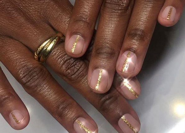 Кој би рекол дека овие два збора можат да одат во една реченица? За да го пробате овој тренд, сè што треба да направите е една вертикална линија со светки. Ако самите се лакирате, тогаш поставете лента селотејп на едната страна и водете се по неа за линијата да биде совршено права.