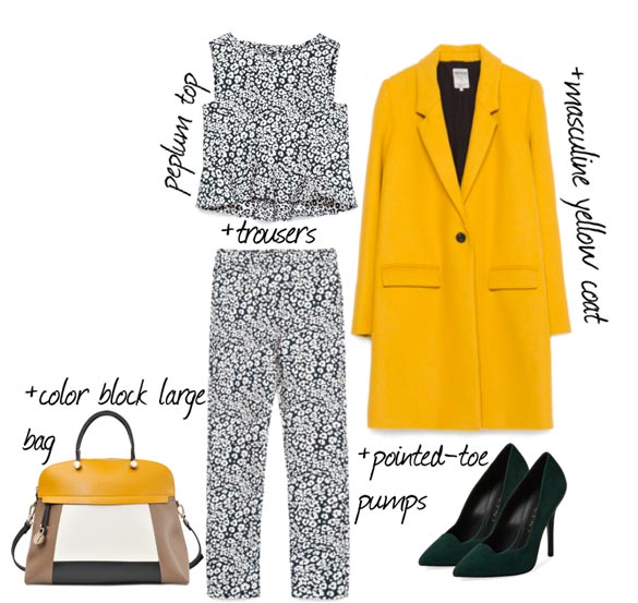 Ако сакате да пробате принт, но не сте спремни за храбар и весел цветен дезен, тогаш одберете некој поминималистички, геометриски принт составен од 2 до 3 бои. Комбинацијата нека ви биде база околу која ќе го формирате целосниот изглед – палтото, обувките, чантата и модните додатоци треба да бидат во центарот. За похрабрите, веселите бои можат да бидат заменети со парчиња со дезен.