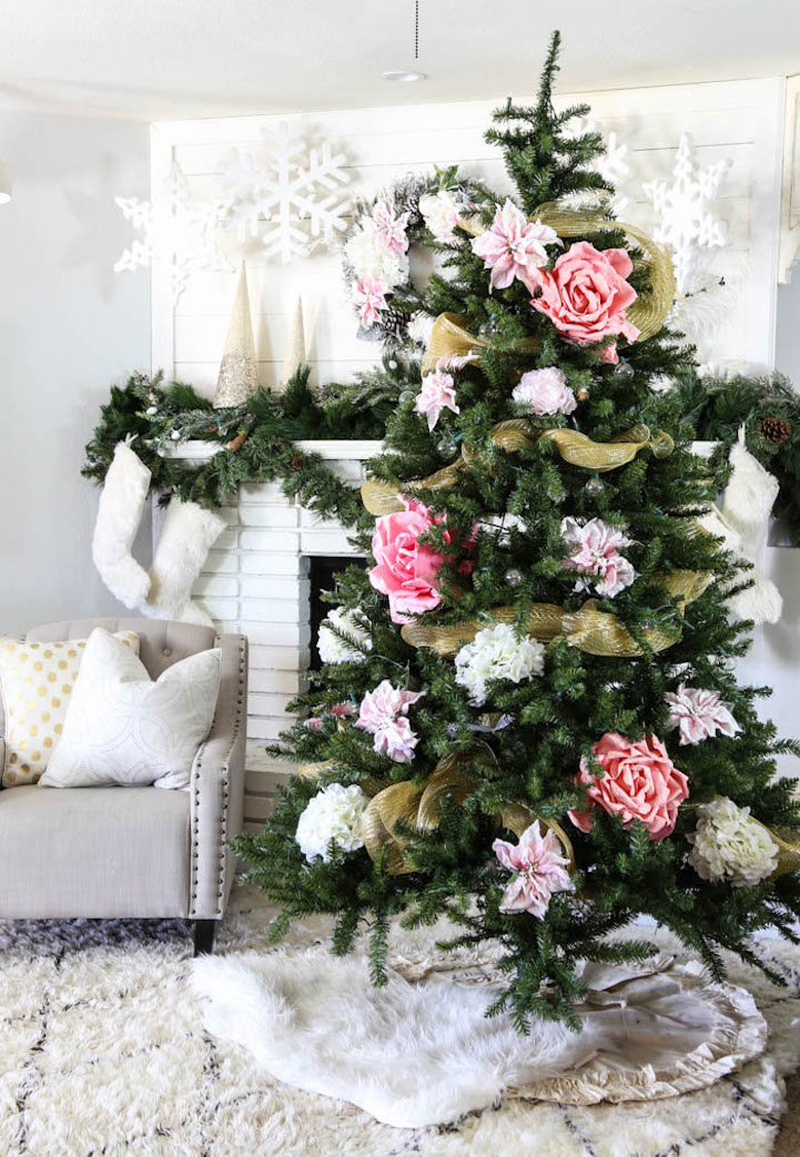 8. Нека елката се вклопи во вашиот животен простор. Доколку сакате минималистички изглед и спој на бои, тогаш следете ја онаа изрека која вели дека малку е повеќе, па затоа вашата елка украсете ја со неколку големи цветови во нежни нијанси и таа ќе изгледа совршено.