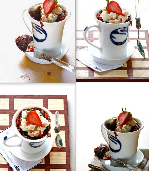 Сите состојки освен парчињата чоколада ставете ги во еден сад. Мешајте добро додека смесата не стане хомогена. Потоа смесата поделете ја во 3 мали шолји или 2 шолји со средна големина, или некаков мал керамички сад. Не ги преполнувајте шолјите, наполнете само 3/4 за подоцна смесата да не се излее надвор од нив. Во секоја од шолјите наросете по неколку парчиња чоколадо. Потоа ставете ги во микробранова печка.