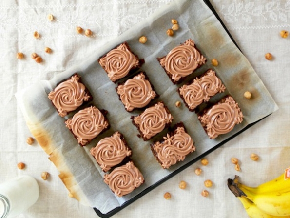 Намрсете ја тавата за печење колачиња со путер, и ставете слој хартија за печење. Доколку немате тава која ќе им даде форма на колачињата, откако ќе се испечат сами исечете ги на коцкички. За крај наросете ги со мелени ореви или друга декорација по ваша желба. Овој десерт може да го сервирате и со сладолед од ванила.