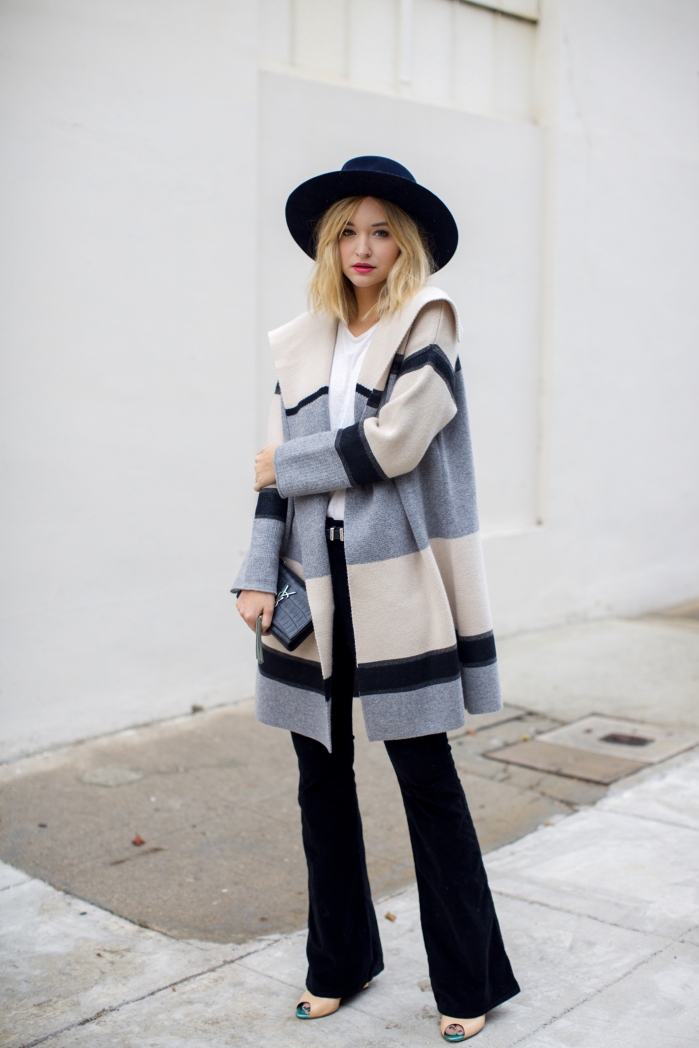 2. „Затоплете“ ја едноставната комбинација со фармерки и бела блуза со помош на XXL шарен капут. Заедно со чизмите со високи потпетици и интересен шешир, ќе изгледате лежерно и модерно. Што ви може сега зимата?