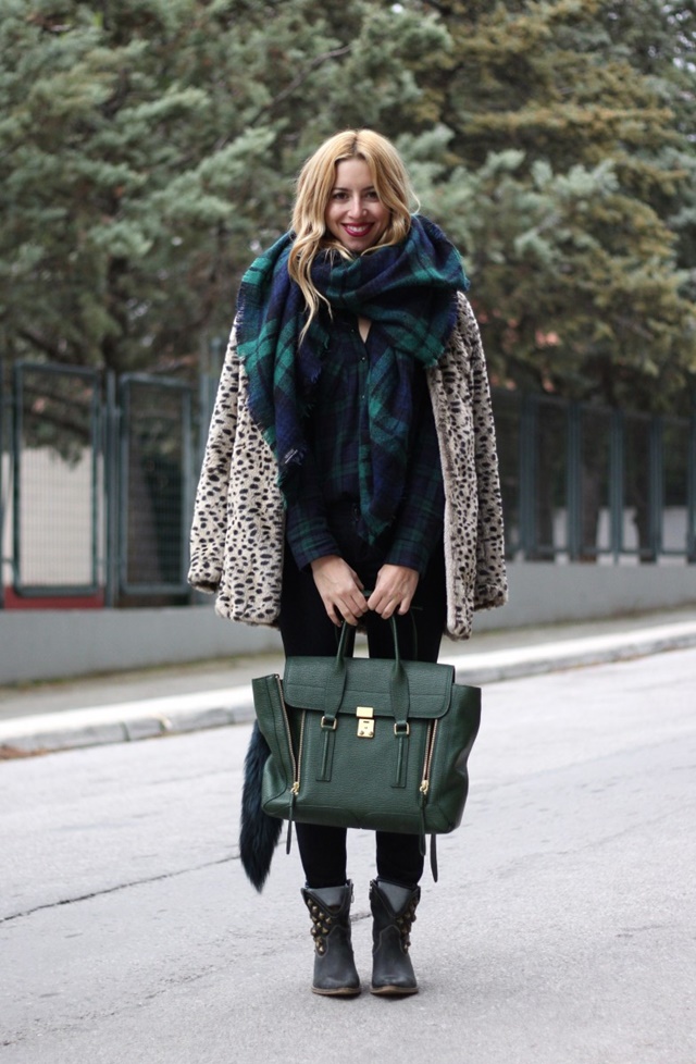 4. Кога станува збор за зимските модни комбинации, не плашете се да експериментирате со дезените. Со црните панталони слободно комбинирајте карирана, зимска кошула со шал во ист дизајн, а целата комбинација „зачинете“ ја со кратка бунда со леопардски принт. На целиот изглед додадете црвен кармин и впечатлива, голема чанта и добивте модерен и топол изглед.