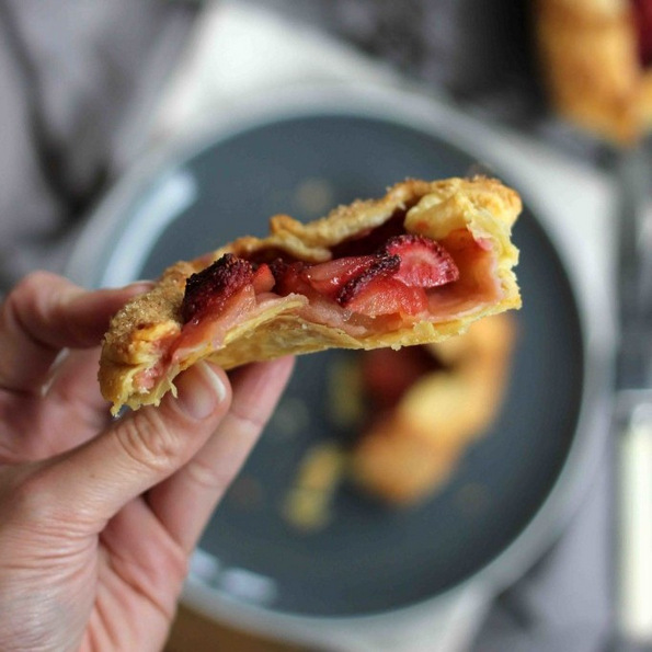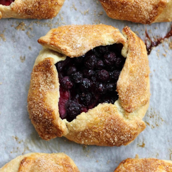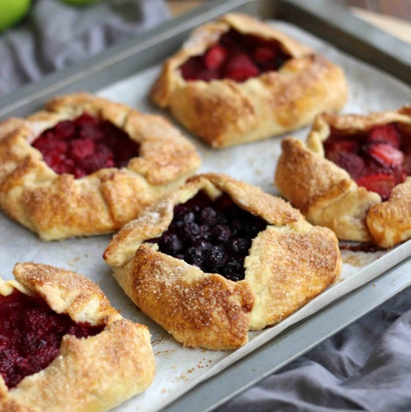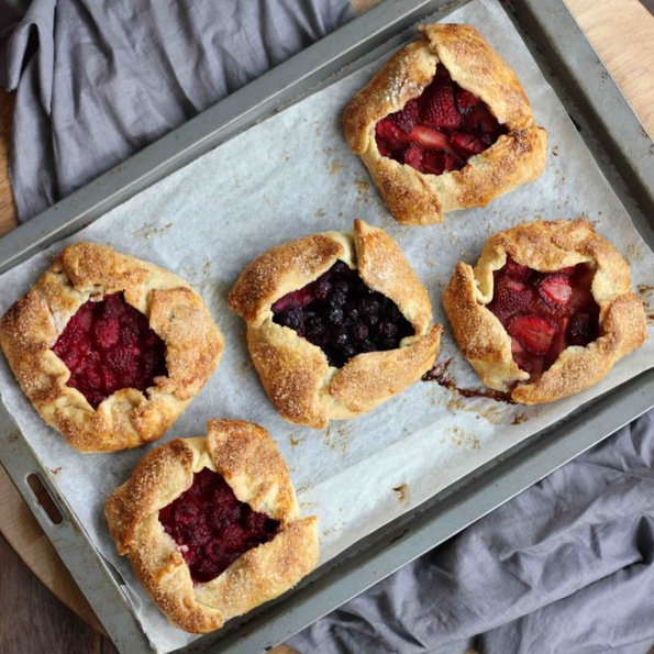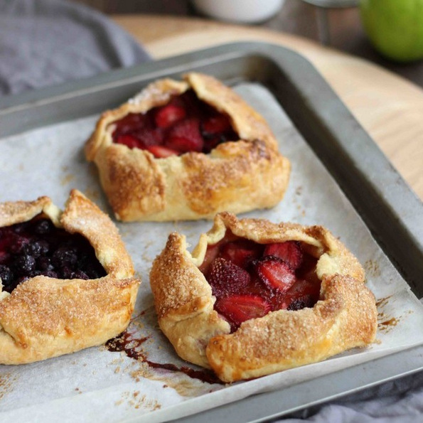 Во меѓувреме измешајте ја жолчката со слатката павлака и подгответе го овошјето. Поделете го тестото на 15 еднакви делови и направете ги во кружна форма, со помалку од 3 милиметри дебелина и вратете ги во фрижидер на 10-тина минути. Поставете врз секое парче малку овошје, оставајќи 20-тина милиметри од страната за да можете да ги превиткате така што делумно ќе го прекриете овошјето. Откако ќе завршите поминете ја секоја галета со смесата од жолчка и испрскајте со малку сиров шеќер.