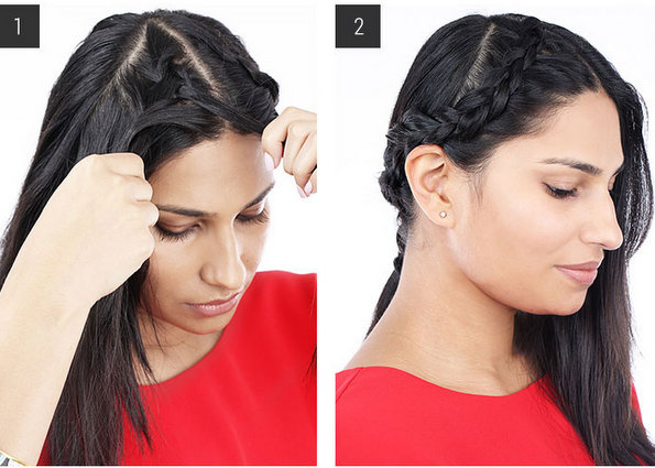 Најпрво разделете ја косата, истакнувајќи го патецот од над челото до темето во права линија. Од двете страни тргнете поголеми триаголни прамени коса (за двете плетенки). Започнете со плетење внатрешни плетенки следејќи ја линијата над увото (како што е прикажано на сликата).