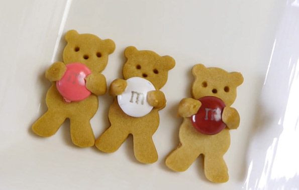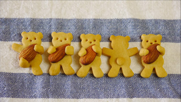 - Нацртајте ги лицата (три точки кои можете да ги боцнете со стапче за ражнич или некое друго шилесто кујнско помагало) и ставете бадемчиња на средината, врз стомакот. Потоа земете ги рачињата на секое мече и направете тие да ги гушнат бадемите.