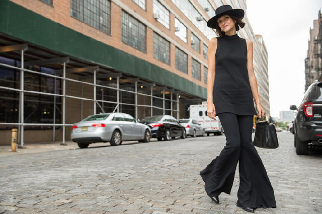 1. Црната туника без ракава и црни, лесни, ѕвонарски пантолони, создаваат една примерна комбинација, која истовремено изгледа и доста модерно. Црниот шешир и црните чевли со шпиц кои би можеле да ги вклопите во оваа комбинација ни докажуваат дека комбинацијата во црно не е досадна, туку има доста предности од кои една е дека ја издолжува фигурата.