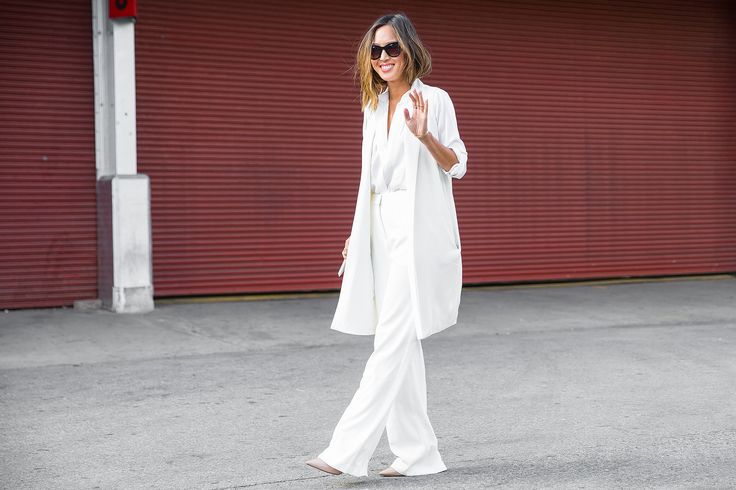 2. После црната комбинација, ви предложуваме една потполно светла комбинација. Повторно ѕвонарски пантолони и чевли со шпиц, а белата кошула и лесниот беж мантил се безвремени парчиња кои мора да ги имате во својот гардеробер. Сите заедно делуваат многу скапоцено, а истовремено така едноставно и лежерно!