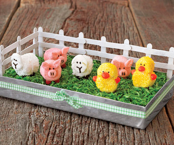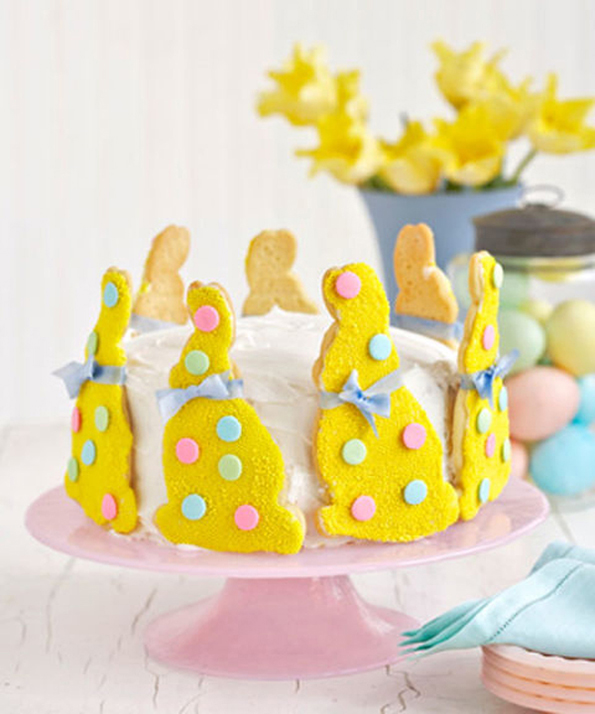 Веќе подготвената торта украсете ја со шеќерни колачи во форма на зајчиња.