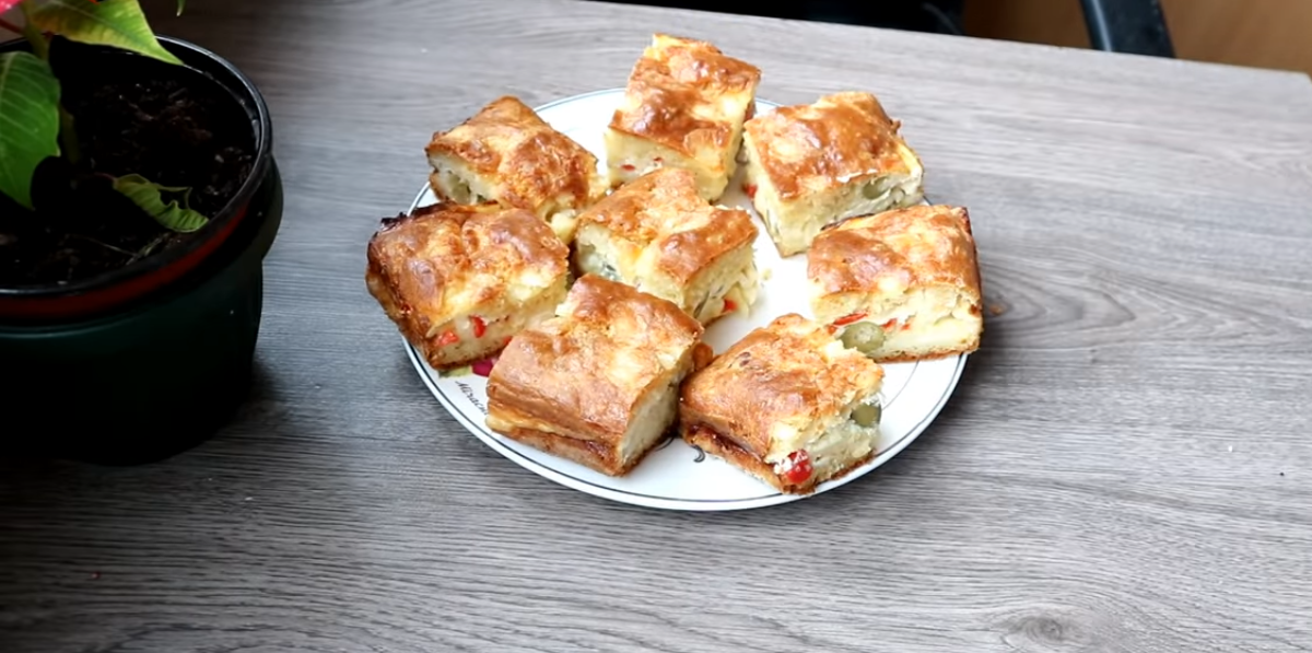 2. Сирењето исечете го на коцки и распоредете го преку тестото. Одозгора наредете исечени маслинки и парчиња пиперка. Измешајте ги павлаката и јајцето и турете ги врз смесата што е во плехот.