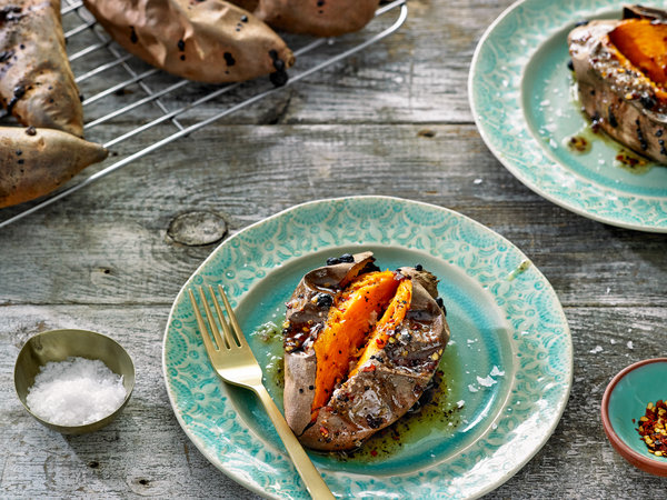 - Извадете ги слатките компири од тенџерето и ставете ги на плех за печење. Печете во загреана рерна на 170 степени Целзиусови околу 10 минути. Проверете дали се меки со вметнување чепкалка за заби.