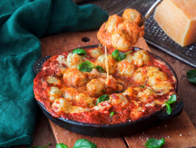 5. Кога њоките ќе бидат термички обработени, промешајте половина од ренданата моцарела и малку свеж босилек.