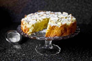 3. Измешајте брашно и прашок за пециво, додадете путер и мешајте додека смесата не стане пенеста. Додадете шеќер, жолчки и јајце, јогурт, кора од лимон и екстракт од ванила и мешајте додека не добиете тесто. Распоредете го на набрашнета површина и обликувајте го во облик на топка.