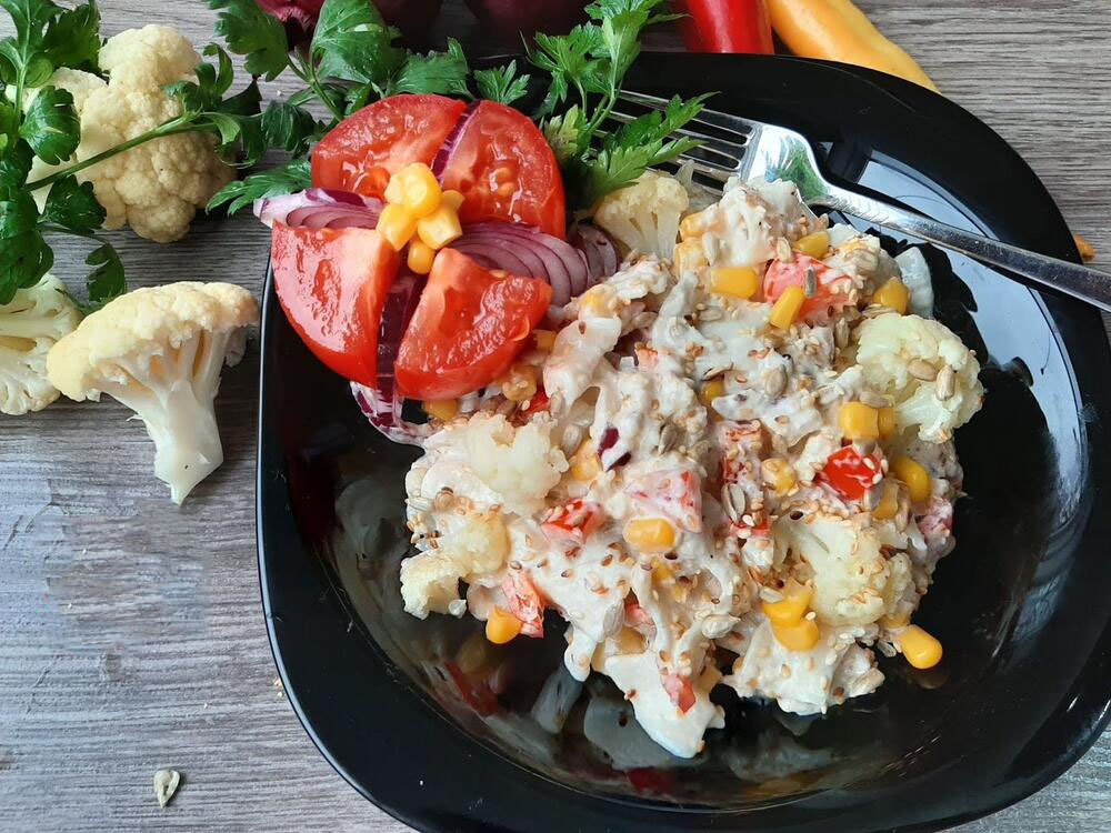 3. Во сварените тестенини додајте ги сите останати состојки: исечканите пиперки и кромидот, мајонезот, сенфот, пченката, карфиолот, сусамот, семките од сончоглед и на крајот додајте ја туната откако претходно ќе ја исцедите од маслото. Измешајте ги состојките додека не се изедначи смесата.