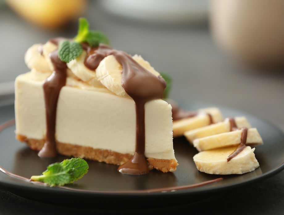 3. Префрлете ја смесата врз бананата и оставете ја одново да се излади. Украсете ја тортата со парчиња лимон или банани и чоколаден прелив. На здравје!