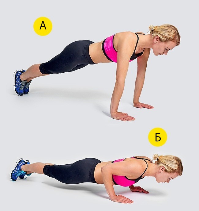 Застанете во позицијата А. Рацете се поставени во ширина на рамената, а рамената, колената и стапалата се во иста линија. Бавно почнете да го спуштате телото свиткувајќи ги рацете и држете ги лактите близу до вашето тело. Вратете се во почетната позиција. Оваа вежба е одлична за вашиот трицепс.