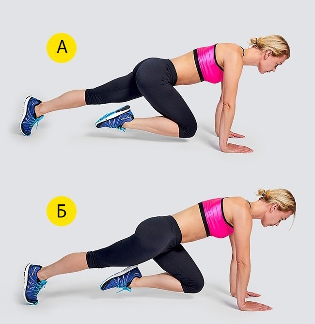 Ова е комплексна вежба која ќе ги зајакне вашите стомачни мускули и ќе ви помогне да согорите калории. Почетната позиција е иста како кај склековите. Стегнете ги стомачните мускули, подигнете ја десната нога и полека придвижете ја кон градите. Внимавајте на положбата на грбот и колковите, тие треба да бидат статични. Вратете се во почетната положба и повторете ја вежбата со другата нога.