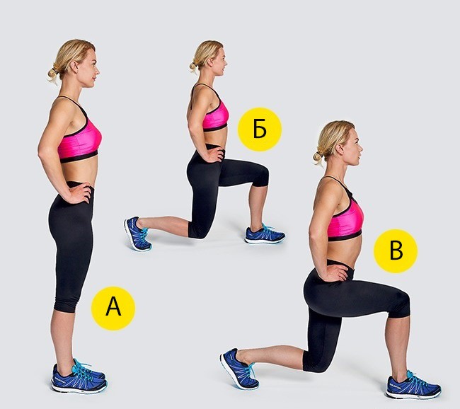 Поставете ги нозете во ширина на рамената, рацете ставете ги на половината. Направете голем чекор напред со левата нога. Левата нога треба да формира прав агол, а десното колено речиси да го допира подот. Потоа вратете се во почетната положба со поттурнување со предната нога. Повторете ја вежбата со другата нога. Кога ја правите оваа вежба, важно е вашиот грб да биде исправен.