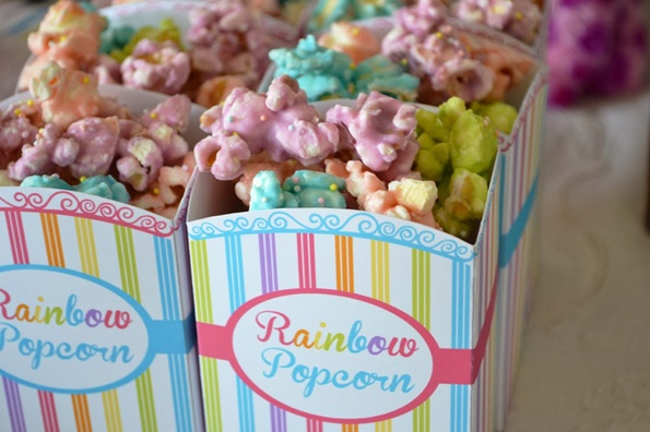 Како и за претходниот рецепт, така и сега растопете го белото чоколадо со малку путер или вода, поделете го во повеќе садови и во секој сад додајте различна боја за храна. И пуканките распределете ги во садови, па прелијте ги со обоеното чоколадо и измешајте.