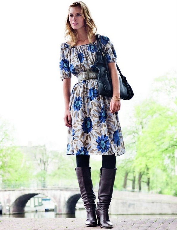 Сигурно си мислите дека цветните фустани се носат само на пролет, но не мора да значи. Потемните цветни нијанси, искомбинирани со хулахопки и чизми во темна боја се супер избор за празничните забави. Нетипично, но многу уникатно и шик.