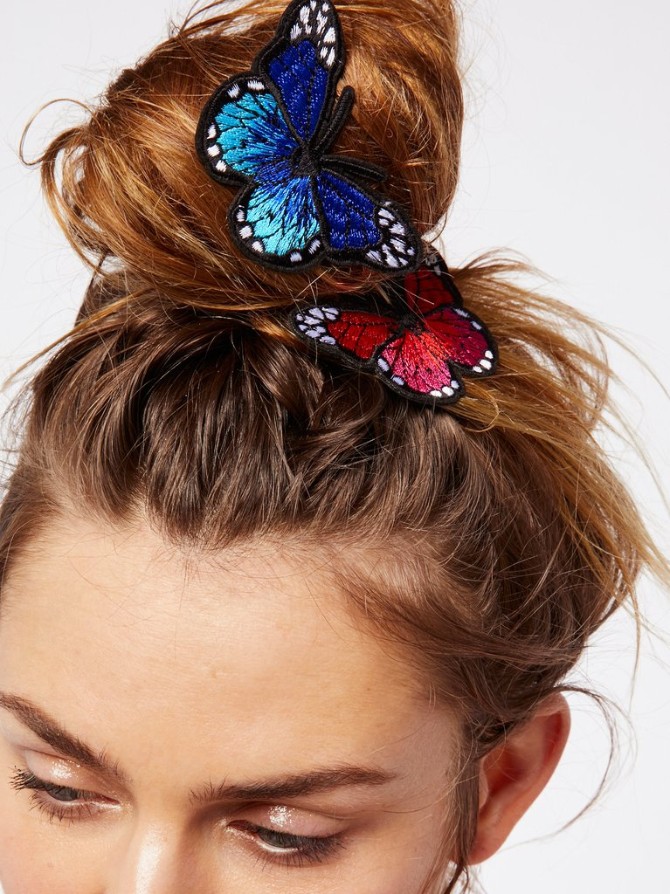 Шнолите во форма на пеперутка се достапни во сребрена и златна нијанса, мали и големи, а доколку не сакате металик украси за коса, тогаш дефинитивно треба да ги испробате стегачите за коса кои се украсени со везени пеперутки.