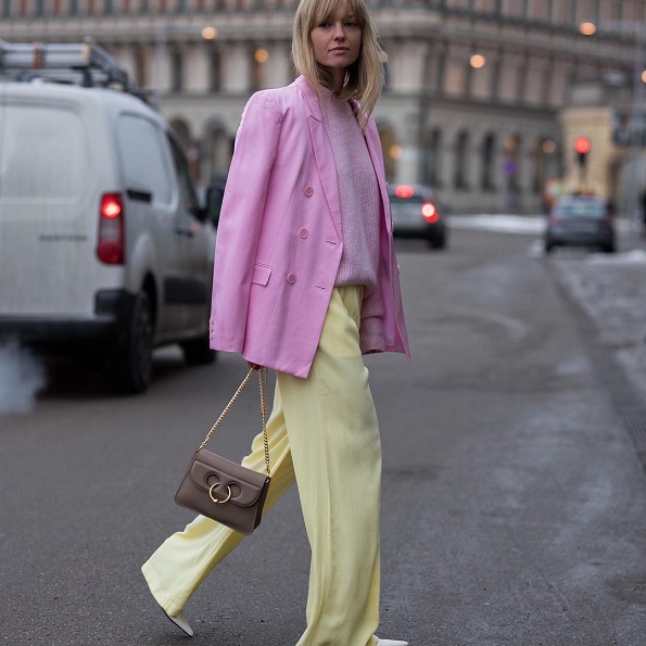 Пастелните бои се непогрешлив избор и лесно се комбинираат една со друга. Доколку одберете комбинација на панталони и сако во пастелни бои, сигурно нема да погрешите. Всушност, ќе изгледате убаво и соодветно на свеченоста, без да треба да размислувате дали сте претерале со комбинацијата. Изберете класични еднобојни чевли и мала чанта.
