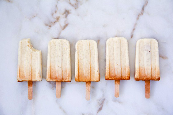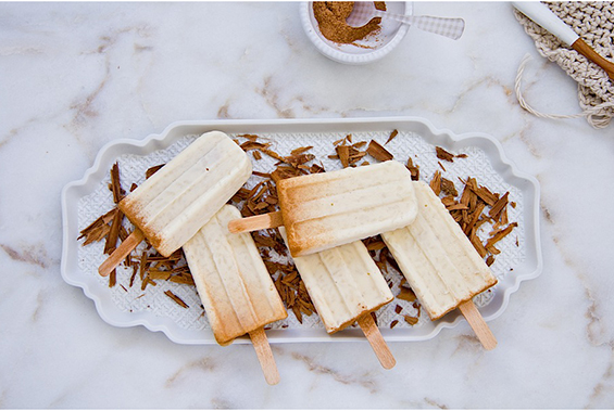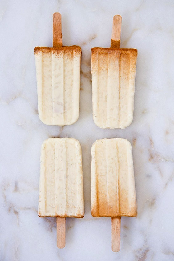 На крајот извадете ја кората од лимон (и стапчето цимет и гравчето ванила доколку ги користевте состојките во овој облик). Оставете ја смесата да се олади 5 минути и потоа ставете ја во модли за сладолед. Брцнете ги стапчињата и ставете ги модлите во замрзнувач. Треба да стојат 6 часа. Пред јадење, сладоледот пропрскајте го со малку цимет.
