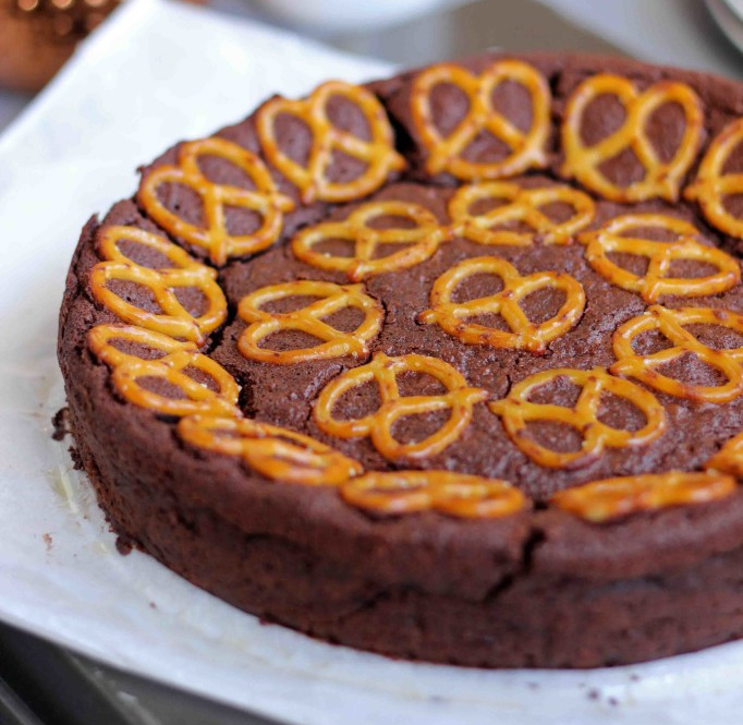 Сместете го чоколадото и путерот во сад отпорен на топлина и поставете го над тенџере со зовриена вода (не дозволувајте садот да се допира до водата). Мешајте повремено сè додека состојките не се стопат и комбинираат, а потоа тргнете го од оган. Измешајте ги жолчките од јајцата со солта, а потоа тргнете ги настрана. Во меѓувреме, поставете ги белките од јајцата во сад и на висока брзина изматете ги со миксер. Мешајте сè додека не се формираат нежни врвови. Намалете ја брзината на миксерот и полека турајте го шеќерот додека мешате и потоа зголемете ја повторно брзината и матете сè додека не добиете смеса која е цврста и сјајна. Нежно префрлете ја смесата со јајцата во смесата со чоколадото и мешајте сè додека не се комбинираат, а потоа префрлете ги во подготвениот сад за готвење и врз нив наредете переци.