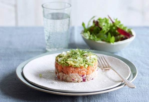 - Слоевите наредете ги според следниот редослед: лосос, ориз, авокадо, слојот од мајонез и зачини, па рендани моркови.