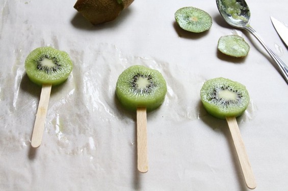 Начин на подготовка: Излупете ги кивите, исецкајте ги на парчиња со дебелина од по 3 сантиметри, ставете им стапче и замрзнете ги.