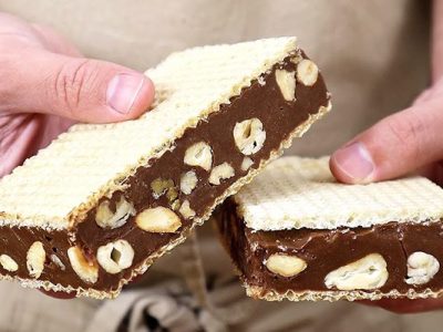 Наполитанките издробете ги со раце, а 150 грама од кикириките сомелете ги на покрупни парчиња. Кикириките, наполитанките и белиот еурокрем измешајте ги заедно.