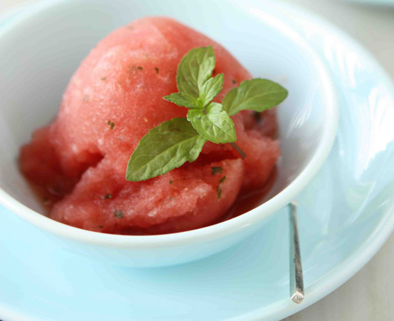 Во блендер ставете ги лубеницата, сокот од лимета и шеќерот. Миксајте додека да добиете еднолична смеса. Потоа, додадете ги нането и румот и повторно миксајте додека да добиете пире. Смесата ставете ја во замрзнувач да отстои околу 30 минути. По 30 минути пирето од лубеница префрлете го во машина за сладолед и продолжете со процесот на подготовка според упатството на уредот. Доколку немате ваква машина, извадете ја смесата од замрзнувач по 45 минути и потоа на секои 30 минути мешајте ја енергично, рачно или со миксер. За да го постигнете бараниот ефект, ова ќе треба да го правите 2-3 часа. На крај, смесата оставете ја во замрзнувач да се излади околу 3 до 4 часа. Сервирајте со алатка за сладолед и декорирајте со свежи ливчиња нане.